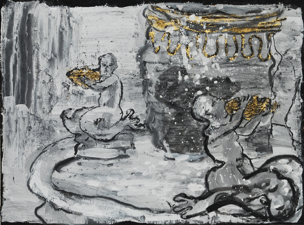 As well as fresco I make sgraffito (lime plaster scratched into to reveal the layer below). I often work on portable panels using a mixture of fresco, sgraffito, wax emulsion, metal leaf and egg tempera. I have experimented with ‘strappo’, a technique used for transferring fresco from its original wall or panel and transferring it to a lighter support. This can lead to exciting discoveries, especially when the process is manipulated.