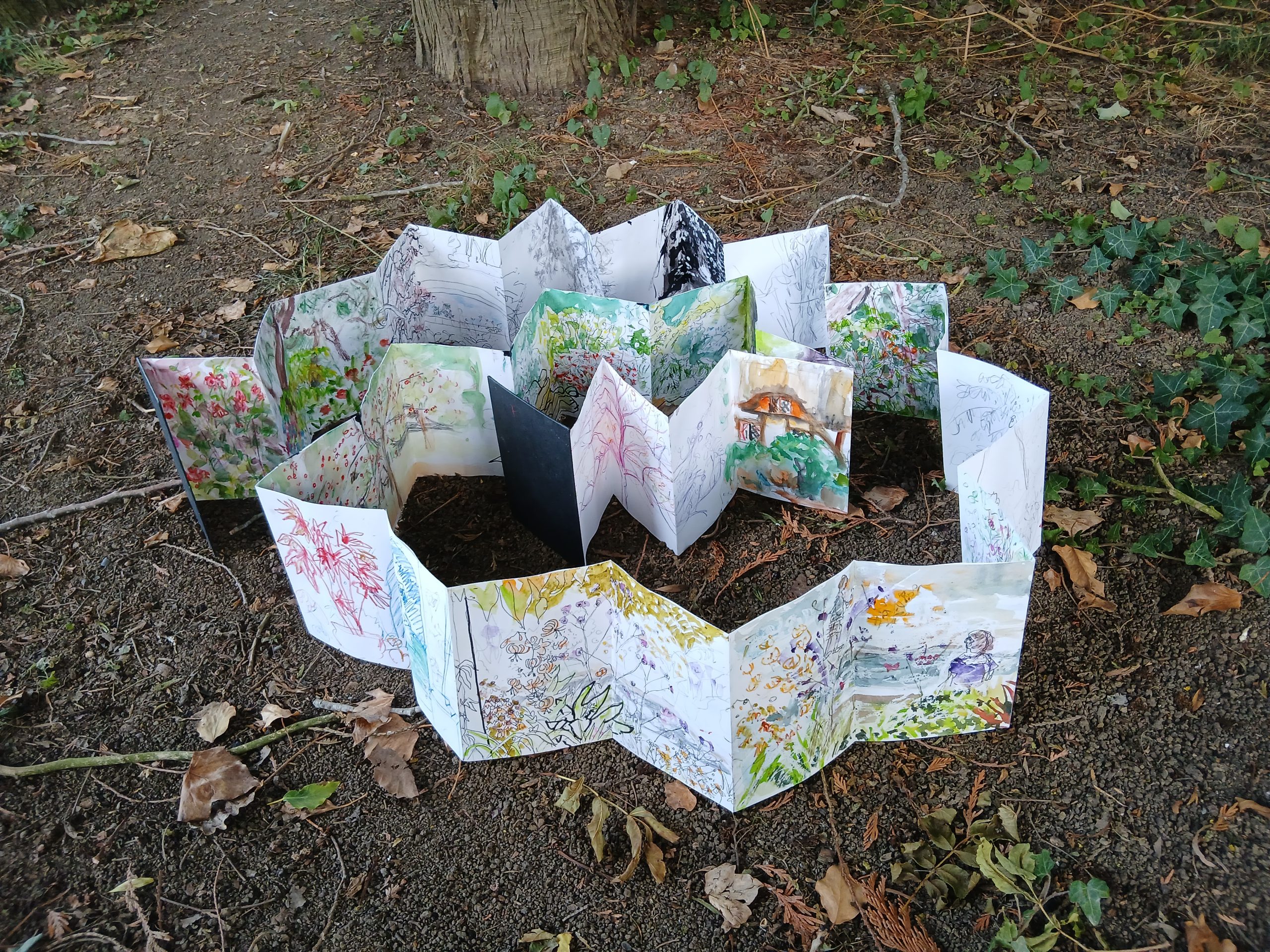 In July 2025, I spent a month in Clifford Chambers, Warwickshire, with the Hosking Houses Trust. I enjoyed working in concertina sketchbooks in the surrounding area using a range of materials, including inks.